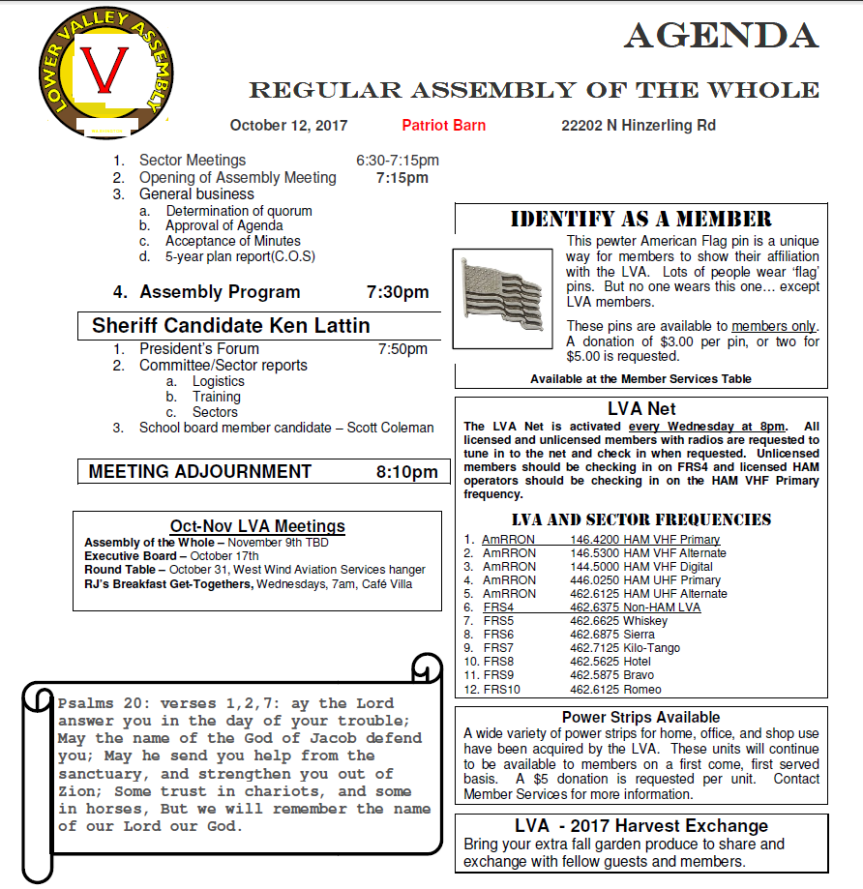 Regular Assembly of the Whole, Oct. 12, 2017 The next regular assembly will be held on Thursday, October 12th, 2017 at 7:15pm at 22202 N Hinzerling Rd. Click here to download the agenda as pdf. Share this: Click to share on X (Opens in new window) X Click to share on Facebook (Opens in new window) Facebook More Click to email a link to a friend (Opens in new window) Email Like Loading... Related