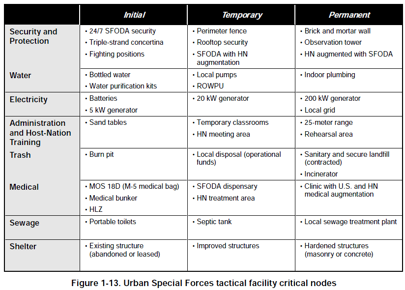 S Army Special Forces, like the rest of the US military, has a set of doctrine regarding the establishment, maintenance, protection, and even closure, of tactical facilities, under field conditions. In current SF doctrine, those facilities are referred to as “Special Forces Tactical Facilities.” These can range from a small, partially developed patrol base for the ODA, all the way up to an SFOB (Special Forces Operating Base), or what used to be called an “A-Camp.”