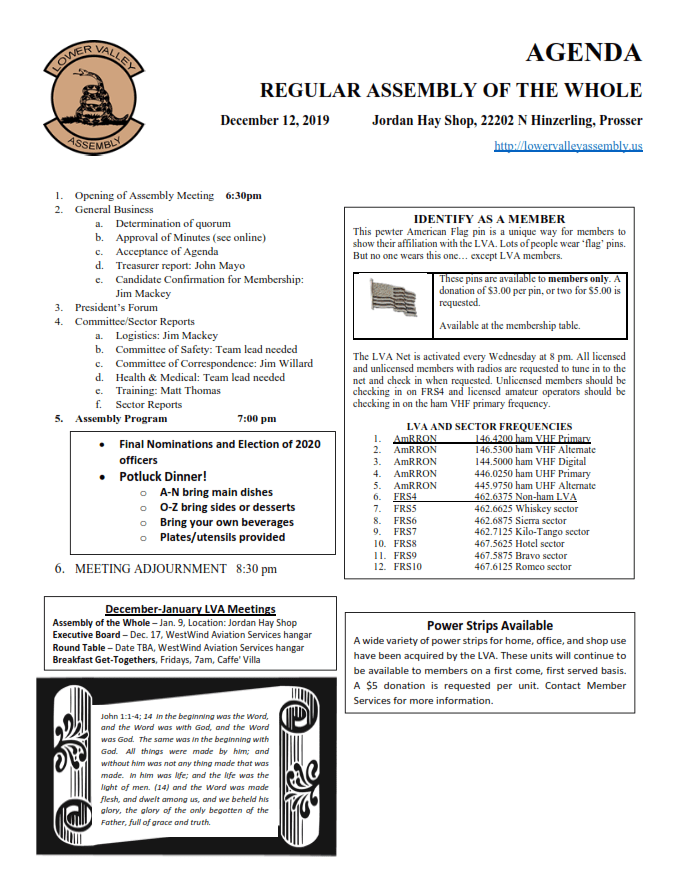 The next general assembly of the whole will be held on Thursday, December 12th, 2019 at 6:30 p.m. at the Jordan Hay Shop, 22202 N Hinzerling Rd, Prosser. We’ll have a final nomination of officers and then hold the 2020 officer elections. After the election, we will have our traditional Christmas potluck.