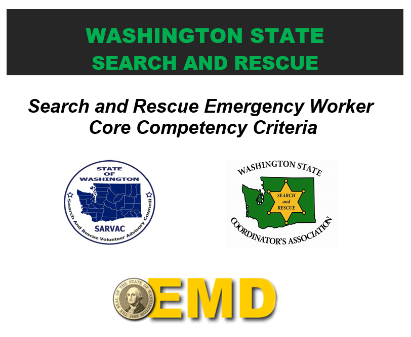 Washington State has established Search and Rescue (SAR) Emergency Worker Core Competency Criteria for personnel who volunteer to work with SAR Teams throughout the state. The skills required of a SAR volunteer include both classroom knowledge and Field Performance Criteria.