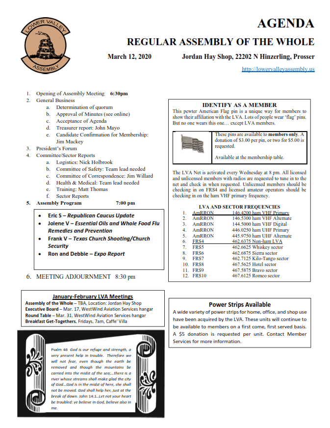 The next General Assembly of the Whole will be held on Thursday, March 12th, 2020 at 6:30 p.m. at 22202 N Hinzerling Way, Prosser.