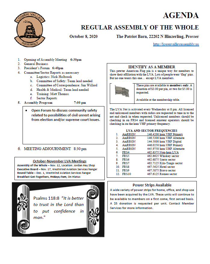 Our next regular assembly of the whole will be held at The Patriot Barn on Thursday, Oct. 8th, 2020. 22202 N Hinzerling, Prosser.