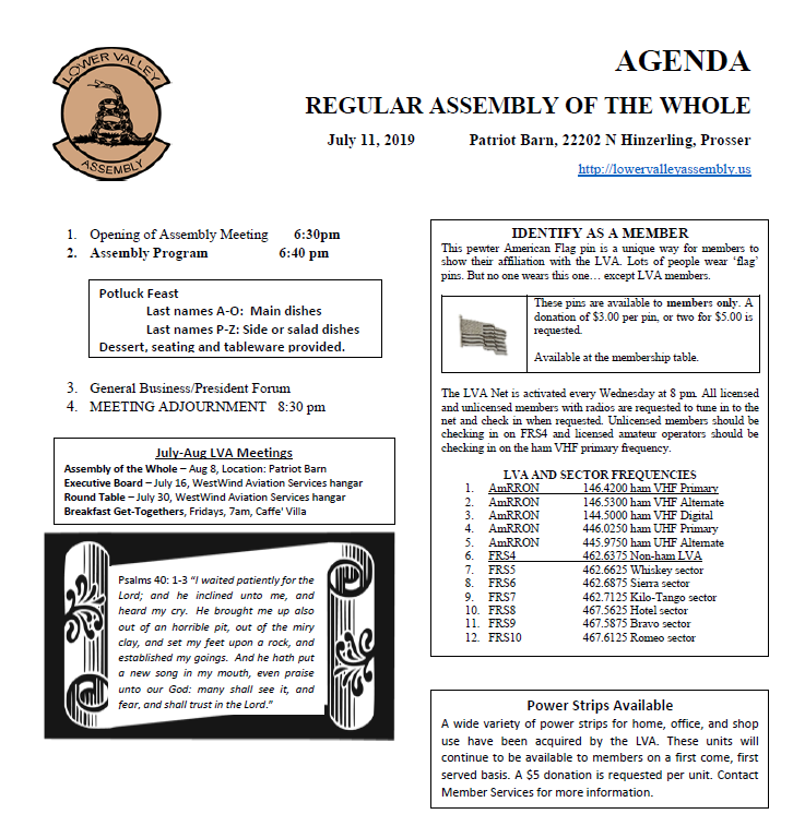 The next meeting with be our Christmas potluck dinner meeting. It will be held on Thursday, Dec. 8th, at 6:00 pm in the Patriot Barn at 22202 N Hinzerling, Prosser.