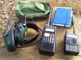 Here are some examples of less-expensive gear you’d use for LLVI. The receiver on the left is a Whistler WS1040. No surprises there. It covers all the necessary bands, does P25 Phase I, trunking, and has Spectrum Sweeper. To the right is an Alinco dual-band (2m/440) HT that has some extended receive coverage up to ~900 MHz. They both have 1/8″ audio jacks for plugging in headphones. I run them right into my amplified shooting earmuffs that conveniently have a 1/8″ audio jack input. It serves both to keep the noise level down at a field LP, and let you hear what’s going on around you. A notebook for logging and keeping useful reference material handy. Spare batteries, writing instrument, and something to hold it all that I found at a local army/navy store.